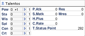 Cada um desses atributos principais podem conceder vários outros status secundários: P.ATK, S.MATK, RES, MRES, H.PLUS e C.Rate.